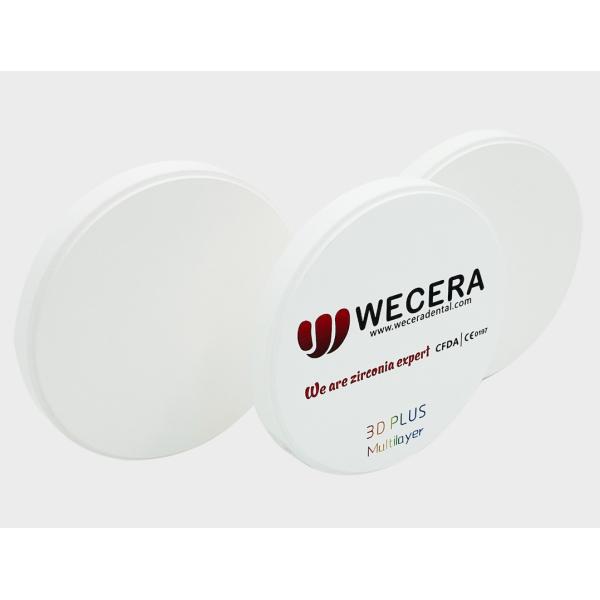 Wecera 3D Plus Multilayer Zirconia Block is made of biological nano zirconia powder 100% from Tosoh with Cold Isostatic Pressing production technology, It is the most natural zirconia in the market, It changes color, strength, and translucency gradually from cervical to incisal part at one zirconia disc.